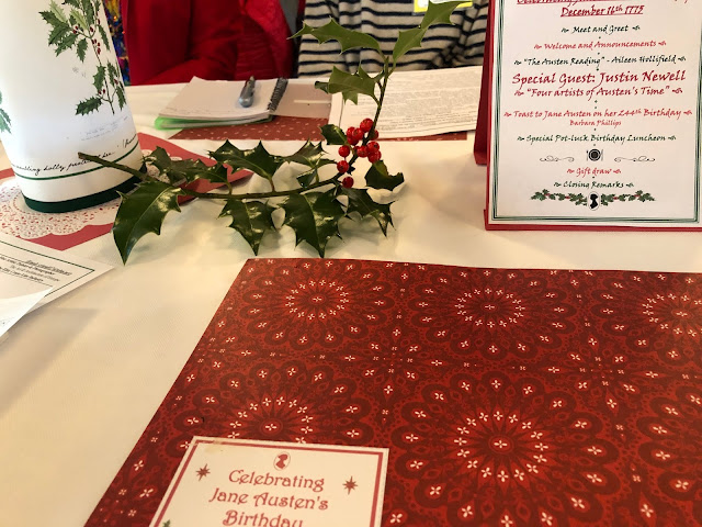 "Dec. 14: Our annual birthday tribute to Jane Austen and special Christmas celebration. We will welcome special guest Justin Newell, Art Historian, Fine Artist: Painter and Photographer to discuss British artists who were Austen contemporaries including John Constable, Sir Thomas Lawrence and Joseph Mallord William Turner and, as a contrast, William Blake.